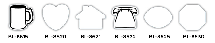 Our Stock Deluxe Coasters are made with 80 pt coaster stock. We offer stock shapes for you to choose from, which are all shown below. They are laminated with ultra clear mylar to protect your design. A layer of cork is adhered to the bottom of each coaster for stability and grip.